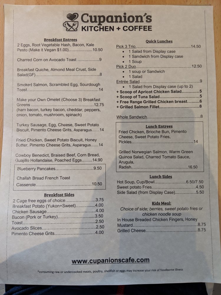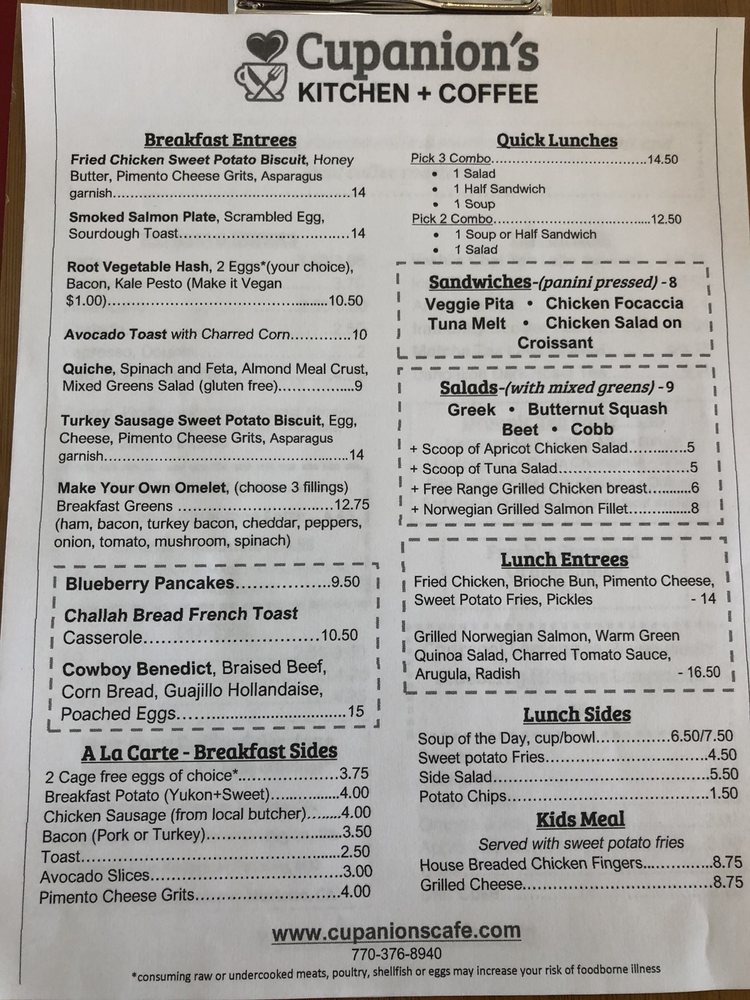 Cupanion's Kitchen & Coffee in Atlanta, GA offers a delightful New American breakfast and brunch menu. The restaurant provides various amenities such as delivery, takeout, vegan options, and wheelchair accessibility. Customers rave about the tasty breakfast options, including pancakes and fried chicken. The ambiance is cozy and welcoming, making it a hidden gem in Buckhead. Prices may be on the higher side, but the quality of food and coffee is worth it. The coffee selection is exceptional, with options like bon bon coffee and specialty sizes. The cold brew coffee is a favorite among customers. With ample outdoor seating and a friendly atmosphere, Cupanion's is a must-visit for a satisfying breakfast experience in Atlanta.